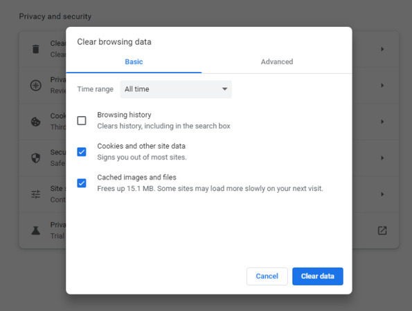 - 캐시된 이미지 및 파일과 쿠키 및 기타 사이트 데이터를 선택합니다.