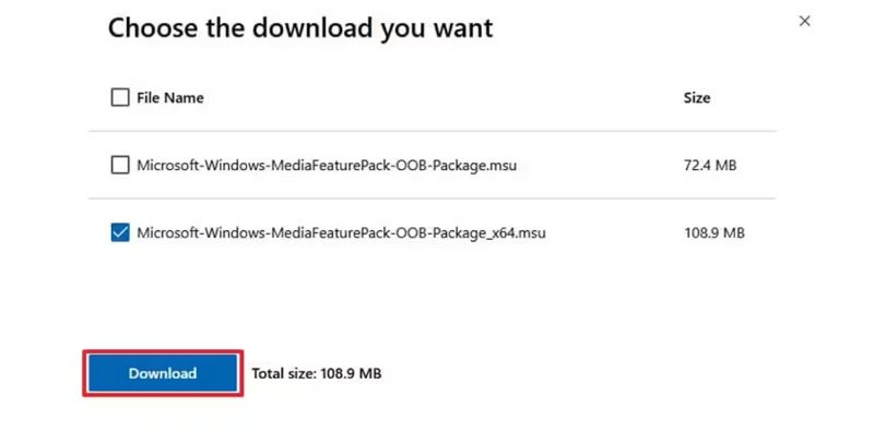 - Media Feature Pack 다운로드 페이지에 접속하여 언어 선택 드롭다운에서 원하는 언어를 선택한 후 다운로드를 클릭합니다.
