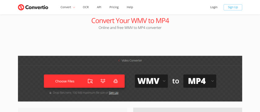 Convertio는 사용하기 쉬운 클라우드 WMV 변환기 무료 도구입니다. WMV, MP4, MOV 등 일반적인 형식을 지원합니다. 특히 Google Drive나 Dropbox에서 비디오를 업로드할 수 있어, 온라인에 저장된 비디오를 WMV MP4 변환기 로 변환하려는 사용자에게 실용적입니다. 인터페이스는 간단하지만, 다른 무료 플랜과 마찬가지로 파일 크기 제한이 있습니다.
